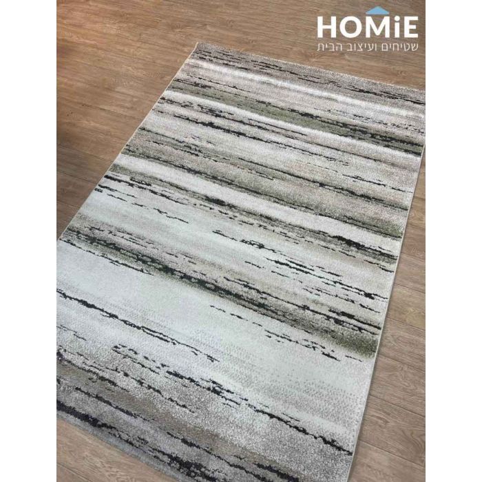 השטיח משלב גוונים של שמנת, אפור, שחור וירוק, היוצרים מראה מודרני, רגוע ומאוזן. הצבעים משתלבים זה בזה בצורה טבעית ומאפשרים התאמה קלה לרהיטים בהירים או כהים.