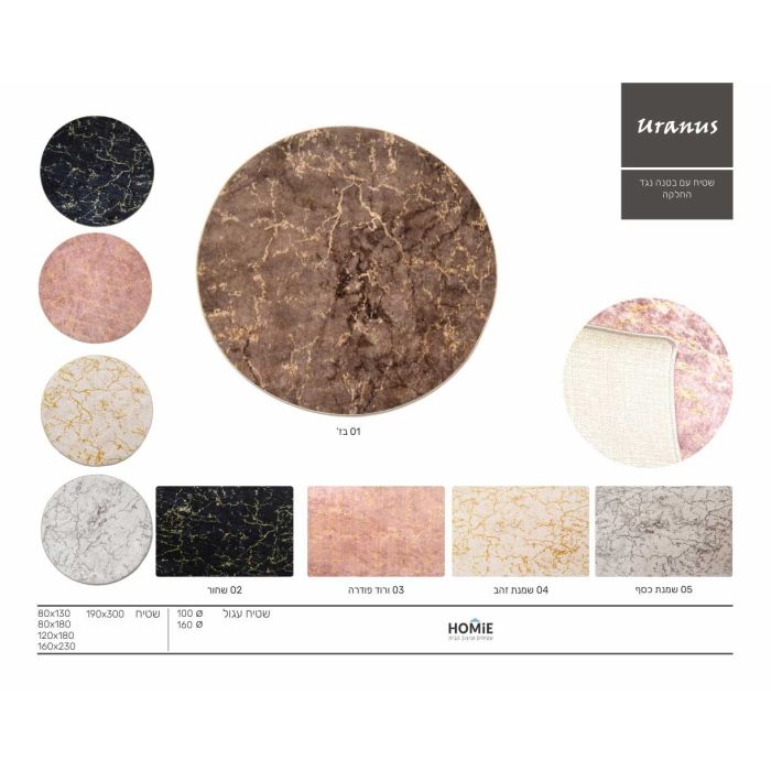 שטיח אבסטרקטי שיש מודרני איכותי דגם אורנוס לסלון, לחדר שינה, לחדר ילדים, לאמבטיה, למטבח, למסדרון, לפינת אוכל, לחדר עבודה ולמשרד. השטיח בעל הגוונים המיוחדים והקונטרסטים החדים יכניס המון סטייל, נוכחת, שונות ויוקרה לחלל הבית. בנוסף הוא ורסטילי, עמיד, יציב על הקרקע, צפוף, נעים למגע, פרקטי וקל מאוד לניקוי. השטיח בעל בטנה נגד החלקה המעניקה לו יציבות על הקרקע.