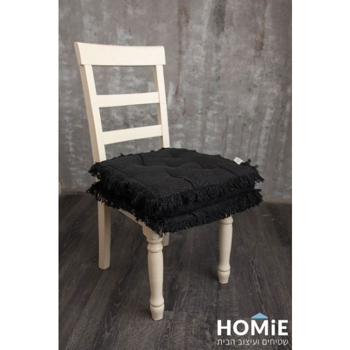 כרית ישיבה לכיסא צבע שחור דגם וידה 06. הכרית היוקרתית והמפנקת נוחה מאוד, מצוינת לישיבה ממושכת, תתאים לכל כיסא סטנדרטי ותשתלב היטב בכל חלל (סלון, חדרי שינה, חדר עבודה, מטבח, פינת אוכל, מרפסת, גינה, משרד, גן ילדים, בית ספר, אולם אירועים). הכרית בסגנון הכפרי עשויה בד איכותי, תפורה בחוזקה, בעלת פרנזים עדינים מסוגננים ומגיעה בתצורה ריבועית פופולרית ביותר. בנוסף היא ורסטילית, עמידה, עבה, פרקטית וקלה מאוד לניקוי.