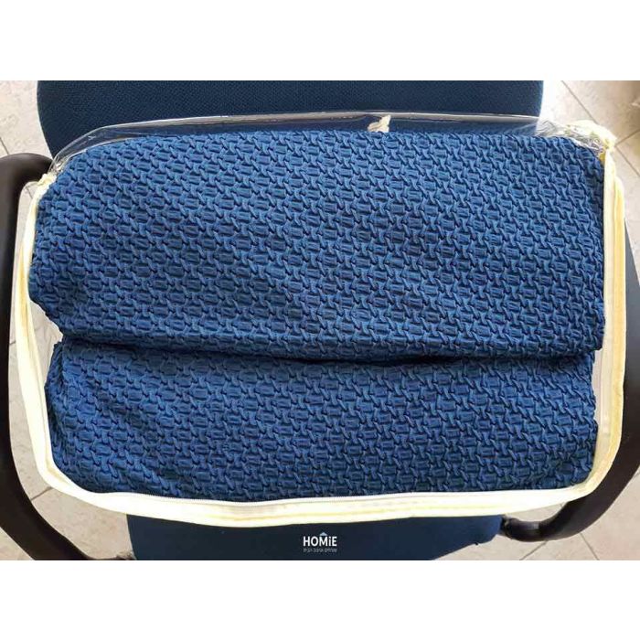כיסוי סלון אלסטי כחול מעויינים עדינים 1+2+3 יוקרתי המתאים עצמו כמו כפפה לצורה וגודל הסלון. הכיסוי בעל יכולת אלסטית מרשימה ביותר (נמתח מכל צדדיו), עמיד, עבה, נעים למגע, כביס ובעל גומי היקפי פנימי השומר על חוזק וגמישות הבד. הכיסוי מתלבש על הספה בצורה אופטימלית ללא שום קמטים וסימני מתיחה.