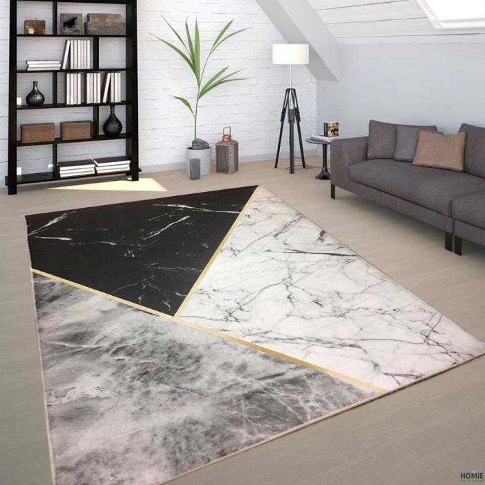 שטיח גיאומטרי אבסטרקטי מודרני איכותי אריחי שיש דגם מסאי 222 לסלון, לחדר שינה, לחדר ילדים, לאמבטיה, למסדרון, למטבח, לפינת אוכל, לחדר עבודה ולמשרד בצבע אפור, שחור, שמנת וזהב. השטיח הלא קונבנציונלי בעל הקונטרסטים המרהיבים בין שלושת צורותיו יכניס המון שונות, שיק, סטייל ויוקרה לחלל החדר. בנוסף הוא ורסטילי, עמיד, צפוף, נעים למגע, פרקטי וקל מאוד לניקוי. השטיח בעל שכבת פי וי סי (PVC) חזקה נגד החלקה המעניקה לו יציבות על הקרקע.