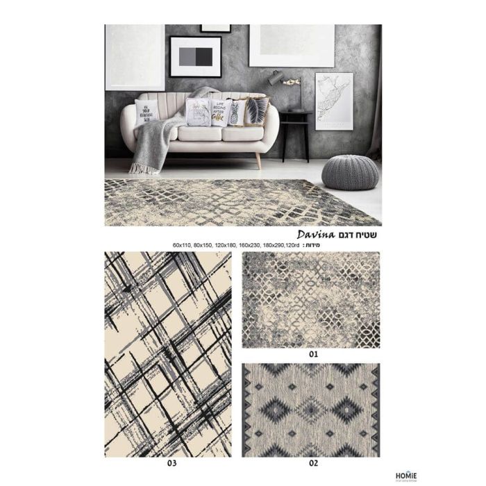 שטיח גיאומטרי כותנה עבודת יד מעויינים אפור דגם דאווינה