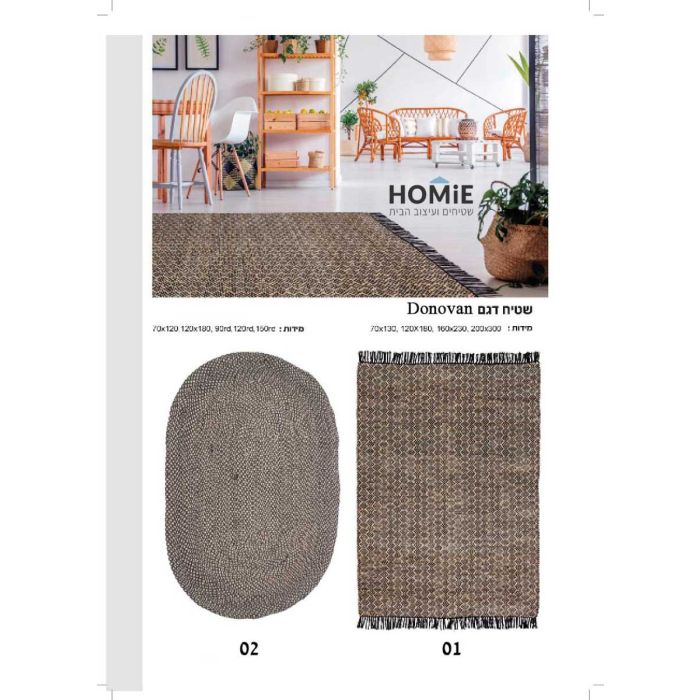 שטיח חבל (יוטה) טבעי גיאומטרי מודרני כפרי עבודת יד מלבן אובלי עגול דגם דונובן. השטיח היוקרתי מתאים לסלון, חדר שינה, חדר ילדים ותינוקות, אמבטיה, מסדרון, חלל הכניסה לבית, חדר אורחים ומשפחה, פינת ישיבה, פינת אוכל, מטבח, חדר עבודה, מרפסת, גינה, משרד, גן ילדים, בית ספר וגן אירועים. הדגם הנפלא נארג בעבודת יד על ידי אמן ומגיע בשלוש תצורות: מלבן, אובלי ועגול. המלבן בעל צורות גיאומטריות מדליקות והאובלי/עגול מגיע בוריאציה חלקה ועדינה יותר. השטיח הכפרי הנפלא הוא רב גוני ולכן יתאים וישתלב בכל סגנונות העיצוב. בנוסף הוא חזק, עמיד, עבה, צפוף, נעים למגע, יציב על הקרקע, פרקטי וקל לניקוי.