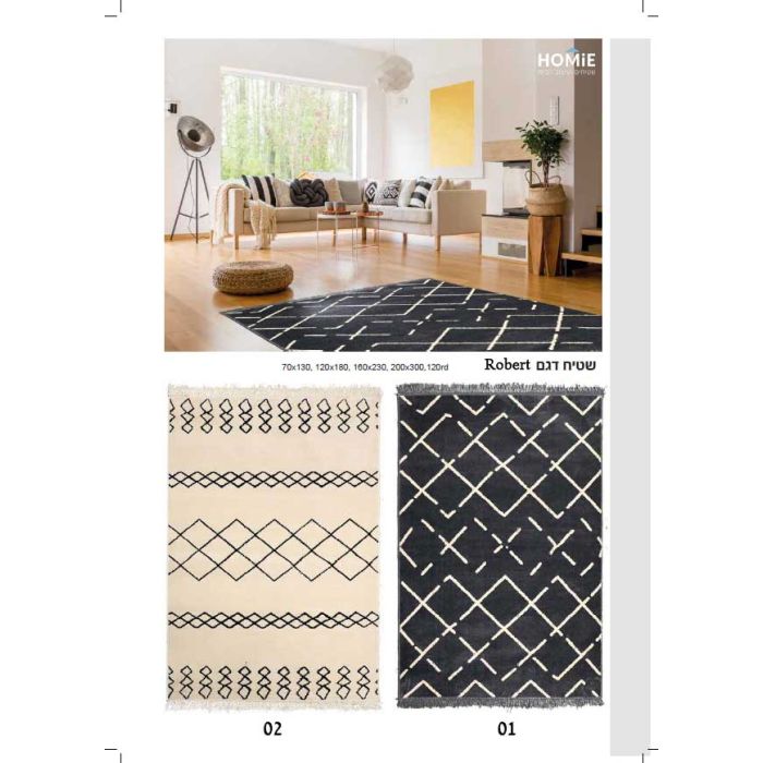 שטיח גיאומטרי מודרני בוהו כפרי נורדי סקנדינבי מעויינים דגם רוברט. השטיח היוקרתי ישתלב בסלון, חדר שינה, חדר ילדים ותינוקות, מסדרון, אמבטיה, חדר אורחים, חדר משחקים, פינת ישיבה, פינת אוכל, מטבח, חדר עבודה ומשרד. השטיח בסגנון הנורדי-סקנדינבי כפרי יכניס המון חמימות לכל חלל בו הוא ימצא. הוא בעל פלומה דקה נעימה ביותר ומגיע עם פרנזים דקים אלגנטיים. הצורות הגיאומטריות הנפלאות מפיחות בשטיח המון חיים ומשדרגות אותו בכמה רמות. בנוסף השטיח ורסטילי (יתאים לסגנונות עיצוב נוספים), חזק, עמיד, צפוף, נעים מאוד למגע, יציב על הקרקע, פרקטי וקל לניקוי.