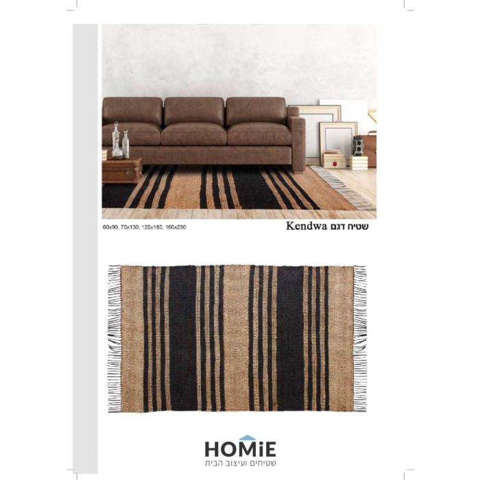 שטיח יוטה (חבל) כותנה גיאומטרי פסים מודרני עבודת יד דגם קנדווה לסלון ושאר איזורי הבית. השטיח היוקרתי והמיוחד בצבעי הטבעי שחור מגיע בסגנון כפרי מובהק ויתאים לכל חלל בבית ומחוצה לו. הוא נארג בעבודת יד על ידי אמן הודי והושקעה בו עבודה רבה. מה שמייחד את השטיח זה השילוב הלא שכיח של יוטה וכותנה בצוותא, שילוב איכותי פשוט מנצח. הקונטרסטים בין הצבעים מוסיפים לו המון שיק וסטייל וחדות נעימה בעין. תוסיפו לזה את הפרנזים העדינים והאלגנטיים ותקבלו את השטיח האולטימטיבי. השטיח מגיע בקונסטלציה ניטרלית ולכן ישתלב בצורה אבסולוטית בכל סגנון עיצוב. בנוסף הוא חזק, עמיד, צפוף, נעים למגע, יציב על הקרקע, פרקטי וקל מאוד לניקוי.