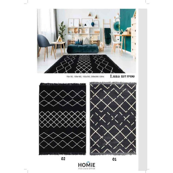 שטיח גיאומטרי מודרני מעויינים שחור לבן יוקרתי דגם לונה. השטיח המגניב יתאים לסלון, לחדר שינה, לחדר ילדים, למסדרון, לאמבטיה, לחדר/פינת משחקים, לחדר אורחים, לפינת אוכל, למטבח, לחדר עבודה ולמשרד. צורות המעויינים המדליקות יחד עם הקונטרסטים המשגעים של השחור והלבן יעניקו לשטיח סטייל וייחודיות. בל גם נשכח את הפרנזים היפיפיים שמוסיפים לו הרבה אותנטיות. בנוסף השטיח ורסטילי, חזק, עמיד, עבה, צפוף, נעים למגע, יציב על הקרקע, פרקטי וקל לניקוי.