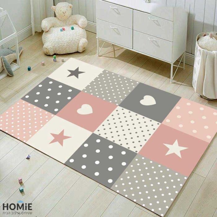 שטיח מודרני לחדר ילדים דגם צורות גיאומטריות בצבעי פסטל. השטיח האיכותי והמיוחד יתאים גם לחדר תינוקות, חדר אורחים, פינת משחקים, גן ילדים ובית ספר. ילדכם אוהב צורות (לבבות, כוכבים, עיגולים) שמחות ומגניבות? מעולה! זה השטיח המושלם עבורו. שטיח שיעלה חיוך תמידי על פניו. מוצר נפלא שיכניס המון שיק וסטייל לחדרו. יתרונו הגדול של השטיח: שערות נמוכות. לכן ילדכם יוכל לשחק עליו עם משחקים שונים בלי שום קושי כזה או אחר. בנוסף הוא חזק, עמיד, צפוף, נעים למגע, יציב על הקרקע, פרקטי וקל מאוד לניקוי. מגיע עם שכבת גומי מעולה נגד החלקה. ניתן לכבס ב30 מעלות (כיבוס בנפרד). ניתן להשתמש במייבש ביתי. אין להשתמש בחומרי הלבנה.