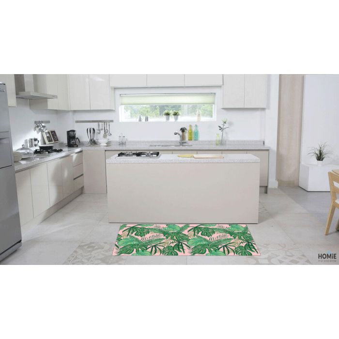 שטיח ויניל איכותי פי וי סי (PVC) לינולאום בהדפסה איכותית עם שכבה נגד החלקה דגם טרופי ורוד. השטיח ורסטילי (מתאים למטבח, לחדר ילדים ועוד), פרקטי, חזק וגמיש, קל מאוד לניקוי (עם מטלית לחה) ולייבוש. הוא מתיישב בצורה אופטימלית על הרצפה, אינו סופג מים ובעל עמידות גבוהה.