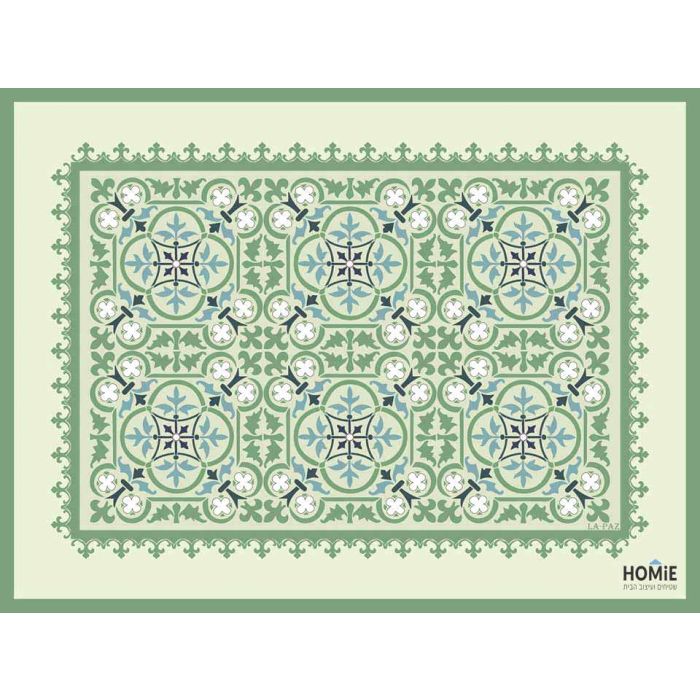 שטיח איכותי ודקורטיבי למטבח עשוי פי וי סי (PVC) לינולאום בהדפסה איכותית עם שכבה נגד החלקה דגם פיניקס ירוק בצבע ירוק, תכלת ולבן. השטיח ורסטילי, פרקטי, חזק וגמיש, קל מאוד לניקוי (עם מטלית לחה) ולייבוש. הוא מתיישב בצורה אופטימלית על הרצפה, אינו סופג מים ובעל עמידות גבוהה.
