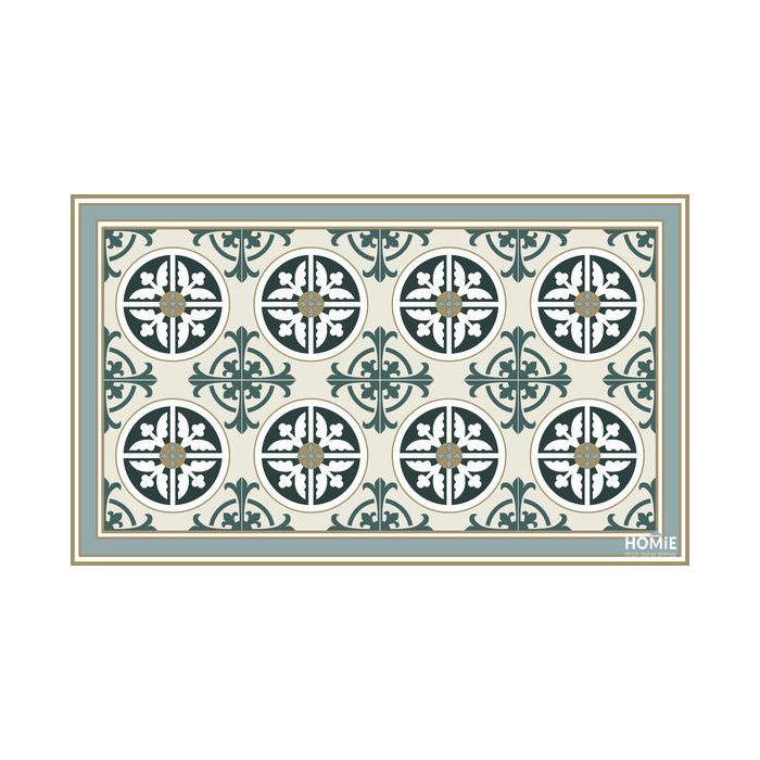 שטיח איכותי ודקורטיבי למטבח פי וי סי (PVC) לינולאום דגם אלישיה בצבעי ירוק, טורקיז, אפור, לבן וכחול כהה. השטיח מיוצר בהדפסה איכותית ועם שכבה נגד החלקה. השטיח ורסטילי, פרקטי, חזק וגמיש, קל מאוד לניקוי (עם מטלית לחה) ולייבוש. הוא מתיישב בצורה אופטימלית על הרצפה, אינו סופג מים ובעל עמידות גבוהה.