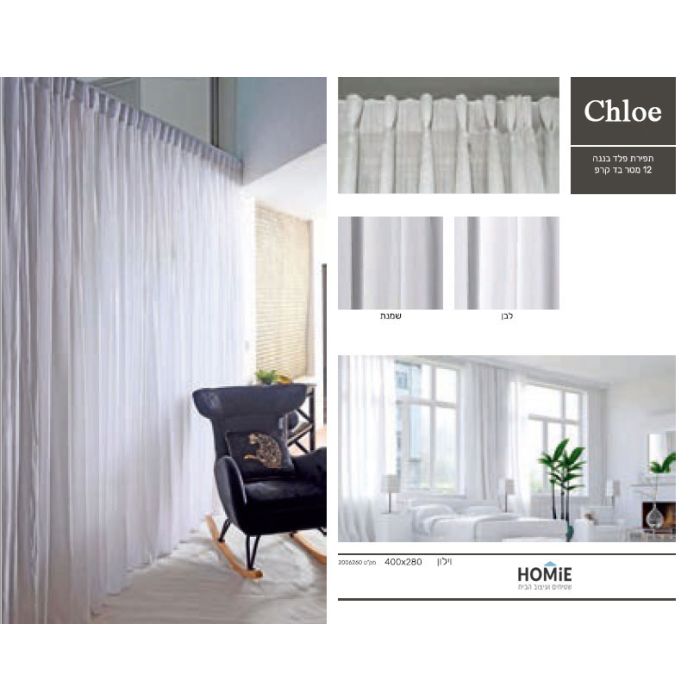 וילון פלדים חצי שקוף מדגם קלואי משלב יוקרה ועיצוב מודרני, ומכניס נוכחות וסטייל לכל חלל. הוילון מגיע בצבעים לבן ושמנת, והחומר הנשפך והעיצוב הייחודי יוצרים תחושת פאר, ואיכות הבד מאפשרת מראה מרשים לצד תחזוקה נוחה.