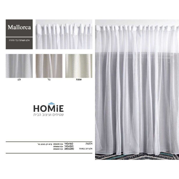 וילון השחלה מודרני בד תחרה חצי שקוף לסלון ושאר חלל הבית דגם מיורקה. הוילון היוקרתי בסגנון הכפרי מתאים גם לחדר שינה, חדר ילדים, חדר משחקים, חדר אורחים, פינת ישיבה, פינת אוכל, חדר עבודה ומשרד. הוילון בעל טקסטורה עדינה ואלגנטית המשרה שלווה ורוגע. יתרונו הגדול של הוילון: רב גוניות. לכן יתאים לכל הסגנונות: מודרני, קלאסי, וינטג', כפרי, אתני, בוהו שיק ונורדי סקנדינבי. בנוסף הוילון חזק, עמיד, נעים למגע, נשפך יפה, פרקטי וקל מאוד לניקוי. כביסה עדינה 30 מעלות ללא סחיטה.