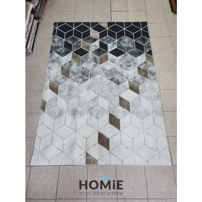 שטיח גיאומטרי מודרני קוביות תלת מימד אפור שחור בז' דגם מסאי 1982