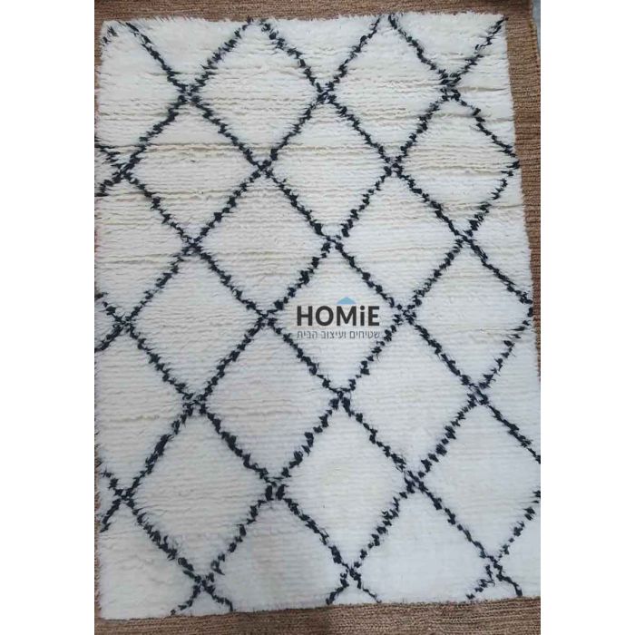 שטיח ברבר מרוקאי צמר עבודת יד גיאומטרי מעויינים שמנת שחור דגם טרויה 305