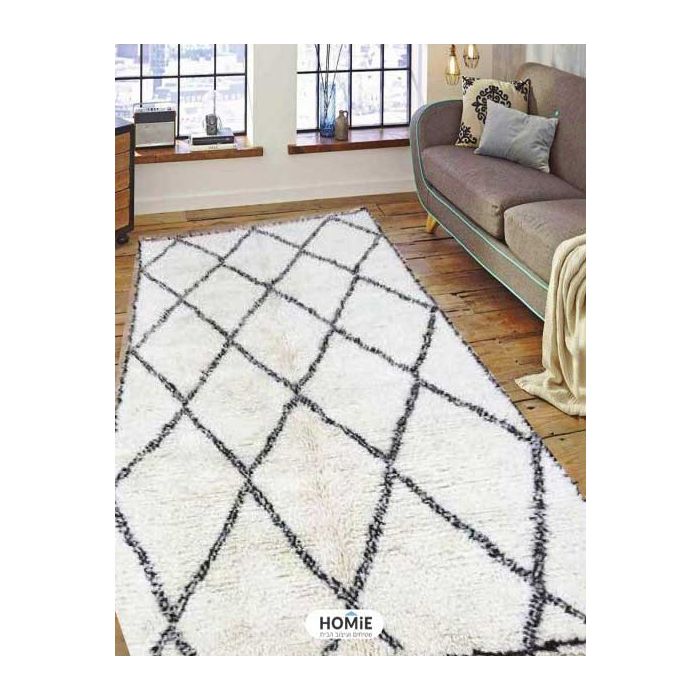 שטיח ברבר מרוקאי צמר עבודת יד מעויינים לבן שחור דגם טרויה 301