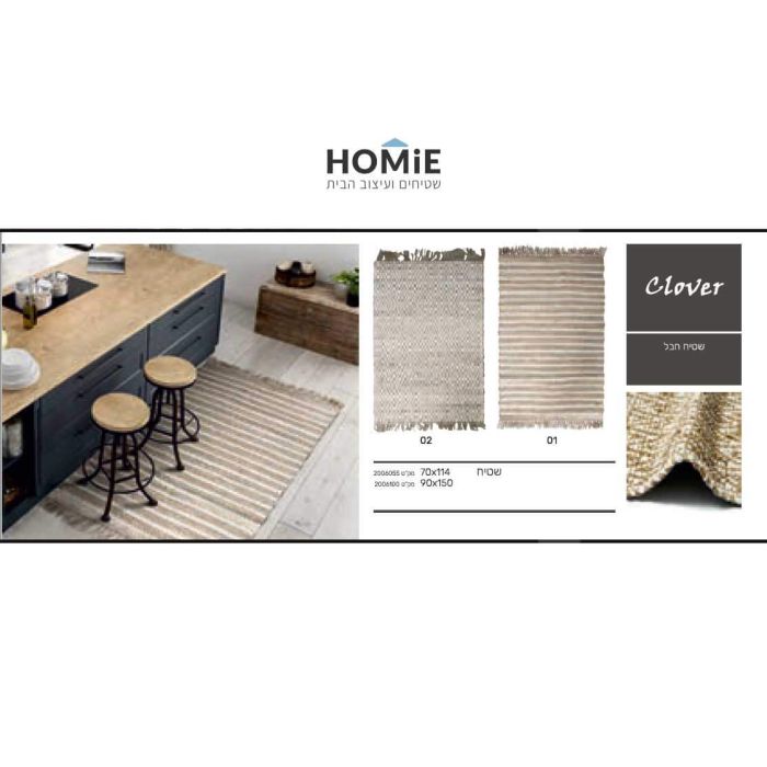 שטיח חבל (יוטה) טבעי מודרני יוקרתי דגם קלובר לסלון, לחדר שינה, לחדר ילדים, למסדרון, לאמבטיה, למטבח, לפינת אוכל, לחדר עבודה, לגינה, לגן ילדים ולמשרד. שטיח החבל הדקורטיבי בקונספט הכפרי מגיע עם פרנזים מסוגננים ונארג בעבודת יד ע"י אמן. הוא יכניס סטייל, נוכחות ויוקרה לחלל החדר ויתאים לכל סגנון בבית. בנוסף הוא ורסטילי, חזק, עבה, עמיד, צפוף, פרקטי וקל מאוד לניקוי.