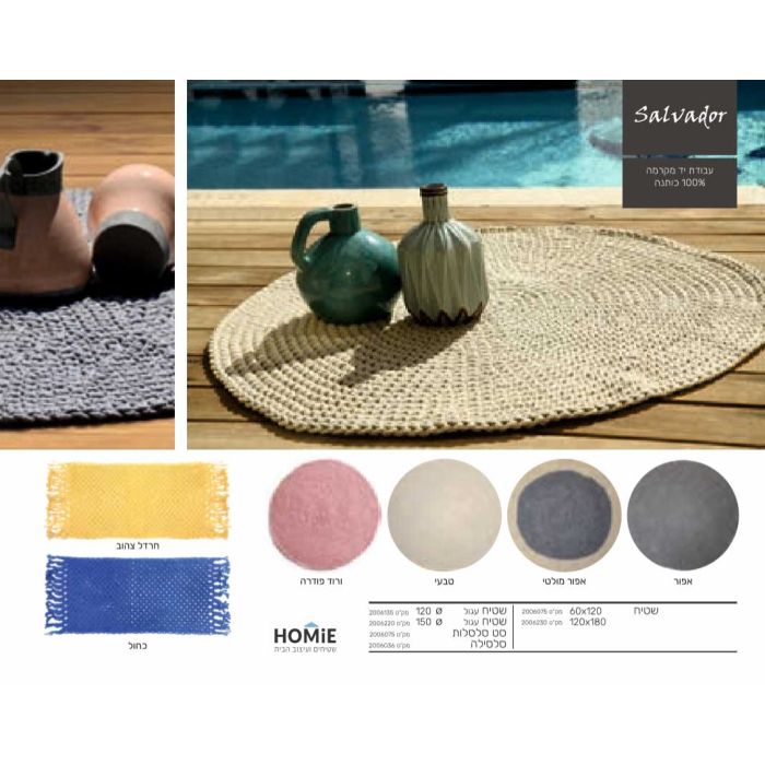 שטיח חבל עגול ומרובע קילים מודרני עבודת יד יוקרתי דגם סלבדור לסלון, לחדר שינה, לחדר ילדים, לאמבטיה, למסדרון, למטבח, לפינת אוכל, לחדר עבודה, לגינה ולמשרד. שטיח המקרמה המיוחד העשוי 100% כותנה נארג בעבודת יד ע"י אמן ויכניס המון סטייל, נוכחות ויוקרה לחלל הבית. בנוסף הוא ורסטילי, חזק, עמיד, עבה, צפוף, נעים למגע, סופר פרקטי וקל מאוד לניקוי.