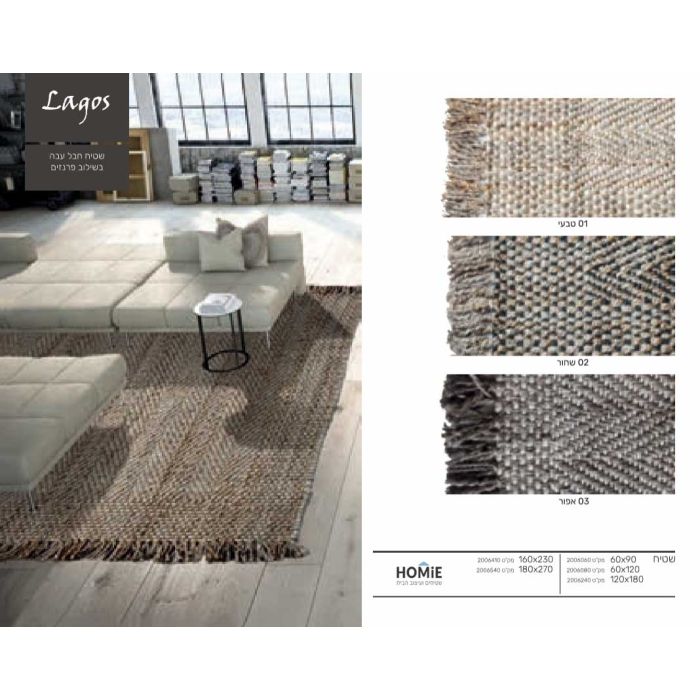 שטיח חבל (יוטה) טבעי עבה מודרני יוקרתי דגם לאגוס לסלון, לחדר שינה, לחדר ילדים, למסדרון, לאמבטיה, למטבח, לפינת משחקים, לפינת אוכל, לחדר אורחים, לחדר עבודה, לגינה, לבית הספר, לגן ילדים ולמשרד. שטיח החבל הדקורטיבי בקונספט הכפרי מגיע עם פרנזים מסוגננים ונארג בעבודת יד ע"י אמן. הוא יכניס סטייל, נוכחות ויוקרה לחלל החדר ויתאים לכל סגנון בבית. בנוסף הוא ורסטילי, חזק, עבה, עמיד, צפוף, פרקטי וקל מאוד לניקוי.