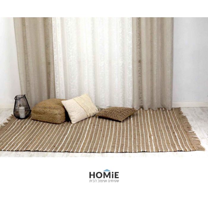 שטיח חבל (יוטה) טבעי עבודת יד משולב כותנה גיאומטרי שבטי פסים דגם מונטריי. השטיח היוקרתי מתאים לסלון, חדר שינה, חדר ילדים/תינוקות, אמבטיה, מסדרון, חדר אורחים, פינת ישיבה, פינת אוכל, מטבח, חדר עבודה, גינה, גן ילדים, בית ספר ומשרד. השטיח הנפלא בסגנון הכפרי נארג בעבודת יד על ידי אמן ויכניס לחלל המון חמימות. הוא עשוי יוטה וכותנה ביחד, קומבינציה ייחודית זו יוצרת קונטרסט מדהים של שני צבעים. מגיע עם בקונסטלציית פסים שבטית מיוחדת שמוסיפה לו המון סטייל, נוכחות ושונות. בנוסף השטיח בעל פרנזים מסוגננים המעניקים לו המון חן. לסיום הוא ורסטילי (יתאים לכל סגנונות העיצוב), חזק, עמיד, עבה, צפוף, נעים למגע, יציב על הקרקע, פרקטי וקל מאוד לניקוי.