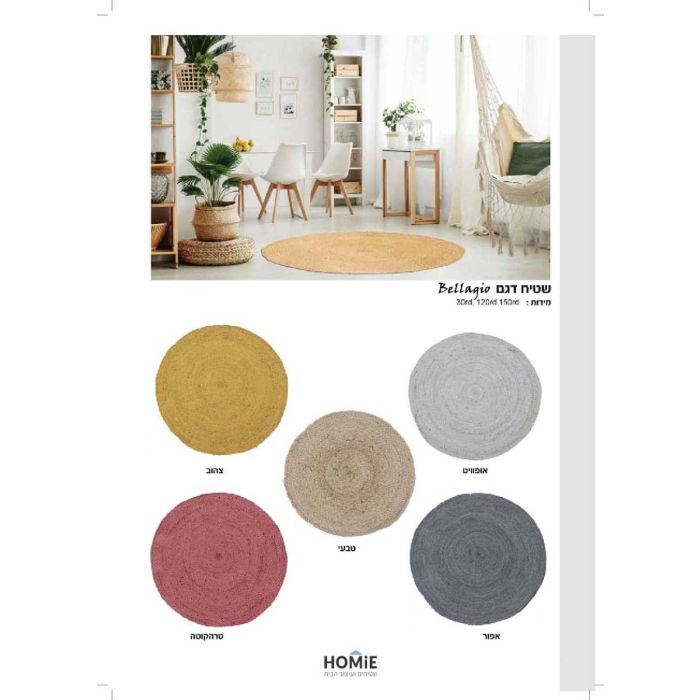 שטיח חבל טבעי עגול עבודת יד דגם בלאג'יו. השטיח היוקרתי מתאים לסלון, חדר שינה, חדר ילדים, מסדרון, אמבטיה, מטבח, פינת אוכל, חדר עבודה, גינה, גן ילדים ומשרד. שטיח החבל בקונספט הכפרי נארג בעבודת יד ע"י אמן ויכניס סטייל, נוכחות ויוקרה לחלל הבית. בגלל הורסטיליות שבו הוא יתאים גם לסלון מודרני וגם לקלאסי. בנוסף הוא חזק, עבה, עמיד, צפוף, יציב על הקרקע, פרקטי וקל מאוד לניקוי.