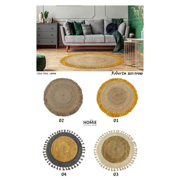 שטיח חבל טבעי עגול עבודת יד דגם רוברטה לסלון, לחדר שינה, לחדר ילדים, למסדרון, לאמבטיה, למטבח, לפינת אוכל, לחדר עבודה, לגינה, לגן ילדים ולמשרד. שטיח החבל הדקורטיבי בקונספט הכפרי מגיע עם פרנזים מסוגננים ונארג בעבודת יד ע"י אמן. הוא יכניס סטייל, נוכחות ויוקרה לחלל החדר ויתאים לכל סגנון בבית (מודרני/קלאסי). בנוסף הוא ורסטילי, חזק, עבה, עמיד, צפוף, פרקטי וקל מאוד לניקוי. דגם 04 מגיע בצבע אפור.