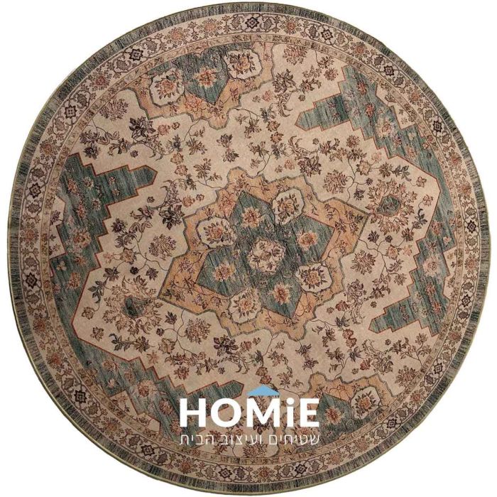 שטיח וינטג' קלאסי עגול דגם קוויבק 66 מביא לחלל שילוב מושלם של אלגנטיות עתיקה ונגיעה מודרנית, עם דוגמת מדליון מרשימה וצבעים עשירים של ירוק עתיק עם רמז לטורקיז דהוי, בז’ וחום־אוקר, המוסיפים עומק, חמימות וסגנון ייחודי לכל חדר. השטיח מעוטר בדוגמת מדליון פרחונית מרשימה, שמביאה חיים, רעננות ותחושה טבעית לכל חלל בבית. השטיח עשוי מחומרים איכותיים, עמידים וקלילים, מאפשר כיבוס ביתי בקלות וכולל משטח גומי נגד החלקה לנוחות ובטיחות מקסימלית בשימוש יומיומי. בזכות עיצובו העגול בקוטר 145 ס"מ הוא מתאים במיוחד לסלון, פינת אוכל, חדר שינה, חדרי עבודה וחללים מעוגלים או קטנים, ומוסיף לכל בית טאץ' קלאסי, מעודן ומלא אופי.