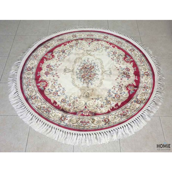 שטיח עגול קלאסי ויסקוזה דמוי משי יוקרתי לסלון, לחדר שינה, למטבח ושאר חלל הבית בצבע שנהב ואדום. השטיח עמיד, צפוף, בעל מגע מאוד מפנק, פרקטי וקל לניקוי.