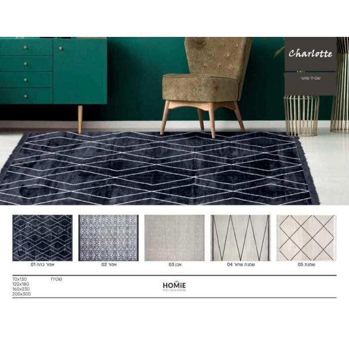 שטיח גיאומטרי מודרני יוקרתי דגם שארלוט לסלון, לחדר שינה, לחדר ילדים, לאמבטיה למסדרון, למטבח, לפינת אוכל, לפינת משחקים, לחדר אורחים, לחדר עבודה ולמשרד. השטיח מגיע בצורות גיאומטריות (מעויינים/ מרובעים/ זיגזג ועוד) מרשימות ויכניס סטייל, נוכחות ויוקרה לחלל בו הוא נמצא. בנוסף יש לו פרנזים עדינים מסוגננים שיעניקו לו הרבה סטייל ואותנטיות. השטיח ורסטילי, עמיד, חזק, צפוף, עבה, נעים למגע, יציב על הקרקע, פרקטי וקל לניקוי.