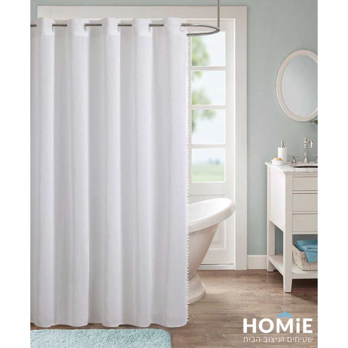 וילון אמבטיה דו שכבתי פשתן חלק פונפונים מודרני דגם מישל